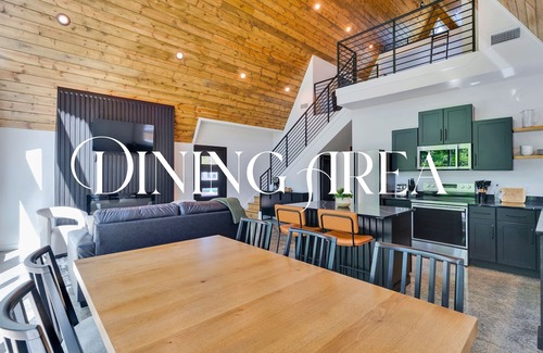 Capone brings a touch of history and charm, with two king bedrooms on the main level sharing a full bath, and a loft featuring one double bed and two twin beds, along with a second private bathroom. The open living space, complete with a fireplace and soaring ceilings, offers a warm, inviting place to unwind. Outdoors, the private heated pool and fire pit area create a perfect setting for both laid-back afternoons and cozy nights by the fire.
