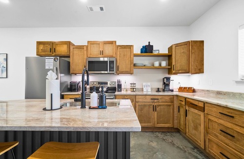 With two king bedrooms and two full bathrooms, the home is well-suited for couples, friends, or small families traveling together. The primary bedroom is on the main floor, while the second bedroom and full bathroom are located upstairs, offering a bit of added privacy. A queen sleeper sofa in the living room creates even more flexibility for overnight guests. The open living area features tall ceilings, soft light, and a modern fireplace, while the fully equipped kitchen includes everything you need for coffee in the morning or dinner after a day of adventure.