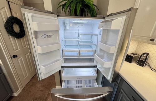 - The kitchen is furnished with new appliances, and a large french door fridge. Find all the dishes and appliances you need, including a Kureg and coffee cups on the house!