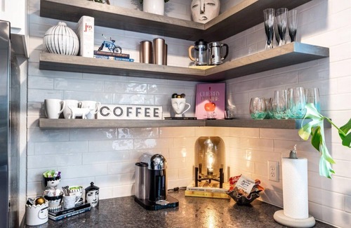 BRAND NEW gorgeous carriage house featuring two comfortable queen beds with high end bedding. Large fully stocked kitchen with leathered granite countertops. For coffee aficionados, there is a Nespresso coffee machine with milk frother, and a French press with bean grinder. Complimentary supplies. Tall ceilings make the space feel even larger. Floor to ceiling bookshelves full of interesting art and books. 4 barstools make it easy to gather for meals and games. 65" Smart TV with cable and super fast WIFI. Beautiful Italian tile throughout. Spacious bathroom with walk-in shower and luxurious towels. Full size washer and dryer. Relax in the comfortable living space for a movie or to enjoy one of the many interesting books. Plenty of space in the 3 car garage for bikes. 6 minute walk to downtown square with many restaurants, shops, and bars. 15 minute walk to Crystal Bridges art museum. 6 blocks from Walmart Headquarters.