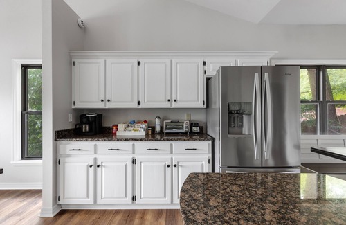 Stairs lead down to lower level (which goes to the lake). Lower level has 3 bedrooms (two king beds, two twin over full bunk beds), and two full bathrooms (shower/tub in one bath; shower only in second bath). There is also a full sleeper sofa with memory foam mattress in the living area downstairs. (Bed coverings/pillows may vary from photos) We do have an alexa dot located in both living areas. They do have the ability to have the microphone turned off or you may unplug them.