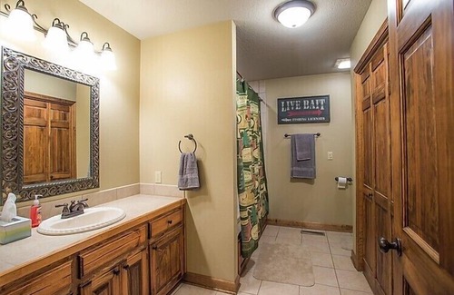 You’ll step inside and be greeted by a river themed cabin. The living room has a rock log fire place and a smart tv where you can stream your favorite shows after a long day of fishing on the Little Red River for the perfect catch of world class trout. It also includes a comfortable single pull out sleeper in the lounger to accommodate an extra guest. You’ll find the master bedroom with a queen size bed and en suite with a jacuzzi tub, two twin beds in the second bedroom, and a queen in the third bedroom. Plus a fully functioning kitchen and two bathrooms. Your family can also enjoy playing games or grilling outside at the end of the day in the spacious yard.
