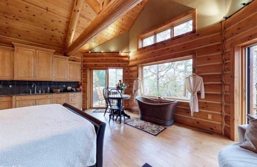 Located only 20 minutes from West Little Rock, An Enchanting Evening is a luxury log cabin retreat where you can escape everyday life. Treat yourself to a relaxing evening in a private mountain top cabin featuring scenic views of Pinnacle Mountain and Lake Maumelle. Picture yourself taking a private dip for two in the hot tub on the back deck surrounded by natural beauty and the night sky. Or, take the time to relax in a hammock while listening to birds serenade you. There is nothing more romantic than gazing at the stacked rock fireplace while soaking in a hand hammered copper double slipper tub. Come enjoy the ultimate rustic luxury relaxation experience available in Arkansas and we guarantee that you will not want to leave!