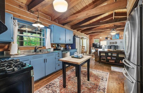 When you're not enjoying our outdoor space, the log-cabin interior offers 2 private bedrooms (one King, one Queen/Twin/Twin), a fully equipped kitchen, and a spacious living room with cozy seating around the wood-burning fireplace.