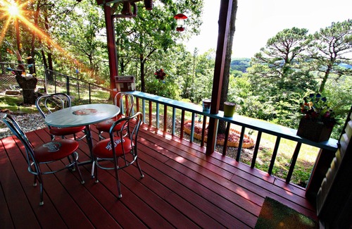 We are located on Highway 62 at Inspiration Point in Eureka West and 6 miles from the town of Eureka Springs, 5 minutes from Beaver Lake and the White River where fishing is superb and approximately 35 minutes from Rogers, Arkansas. We are also located between The famous "Opera Of The Ozarks" and the "Eureka Springs School Of The Arts" (ESSA) where you can take any kind of class imaginable.