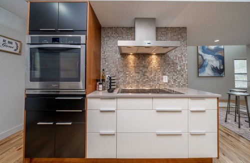 Kitchen: Updated with New Stainless Steel Appliances and Fully equipped with Cookware, Microwave, Blender, Coffee Maker, + all Cooking Essentials.