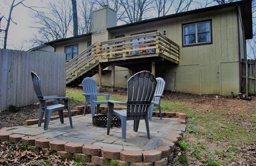 This two-bedroom home is just under 5 minutes from Hwy 71, yet offers a peaceful, secluded feel in a quiet neighborhood surrounded by lush greenery. Spend evenings under the stars by the firepit or enjoy your morning coffee on the deck. Inside, the home features a spacious, inviting open floor plan with modern renovations. Located just 2 minutes from Tanyard Creek and 3 minutes from the Country Club Golf Course, it also provides easy access to the Tunnel Vision Trails. Relax with the whole family in this serene retreat.