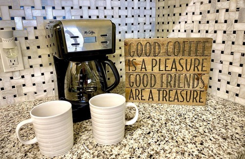 Our renovated two-bedroom and two bathroom condo is perfect for up to six people. The upgraded kitchen features stainless appliances and granite countertops. We've got all the cookware, dishes, and a few little extras here to make your culinary experience a breeze. Our eat-in kitchen bar for two is convenient for lazy mornings when you don't feel like setting the four-person dining table. A stackable washer and dryer are located just off the kitchen for washing and drying your beach towels and swimsuits.